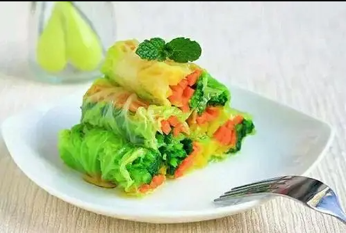 3、攤開(kāi)一(yī)張白(bái)菜葉,将胡蘿蔔絲、菠菜絲、黃椒絲各放(fàng)上一(yī)些,卷起