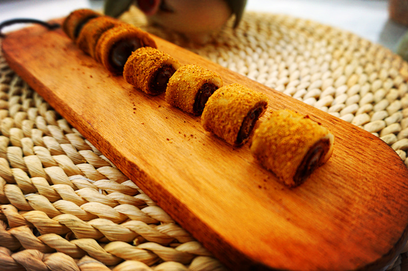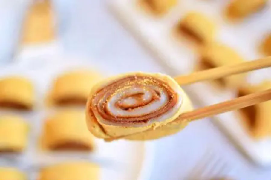 6、抹好醬後,從一(yī)邊卷起,然後切成小(xiǎo)塊,再撒上一(yī)層花生(shēng)芝麻粉末即可。