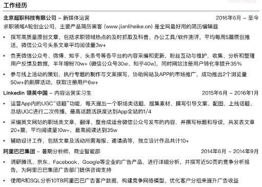簡曆有三種比較流行的排版方式:橫版、豎版、時間線版(結合了橫版與豎版)。這種簡潔明了,從上到下(xià)從左往右符合人閱讀習慣的簡曆,就是HR喜歡的。